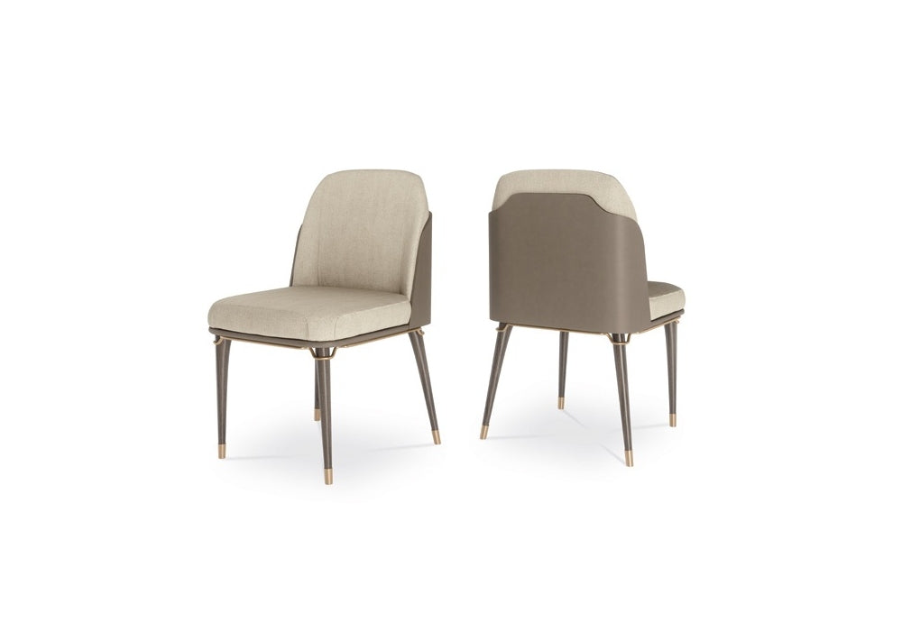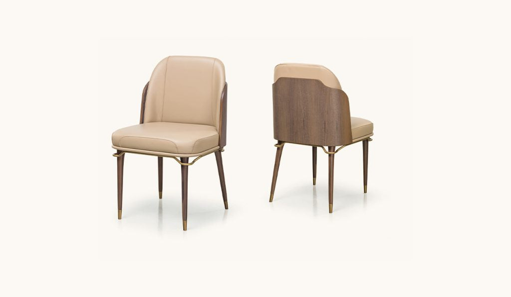 Chiếc ghế từ bộ sưu tập Melting Light có khung gỗ chắc chắn; sản phẩm có sẵn với tựa lưng bằng da hoặc gỗ, và đệm ngồi bằng da hoặc vải. Các chi tiết kim loại được hoàn thiện bằng vàng chải.
