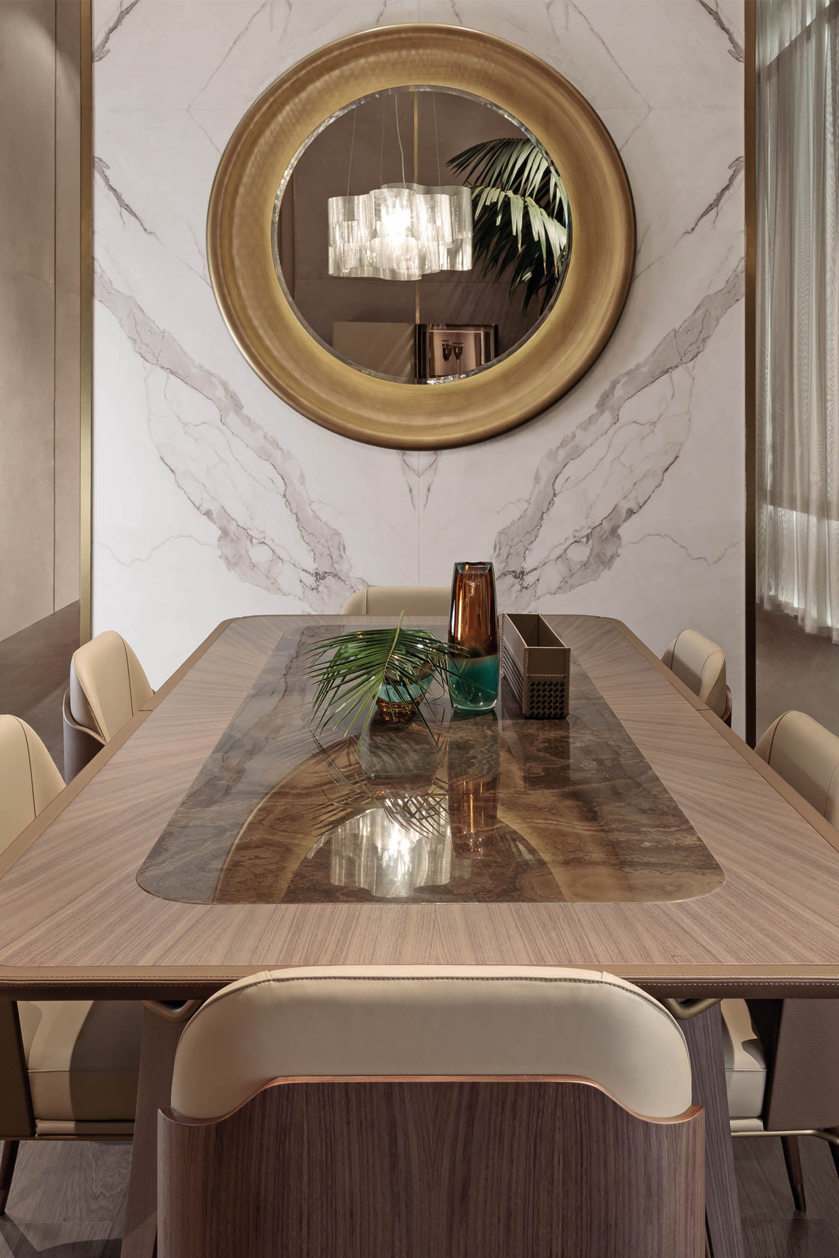 Bàn chữ nhật thuộc bộ sưu tập Melting Light có cấu trúc nhẹ nhàng với chân bàn và bề mặt mỏng có các chi tiết da. Chi tiết kim loại ống chạy dọc theo toàn bộ đường viền của bề mặt bàn là yếu tố đặc trưng của toàn bộ bộ sưu tập. Bề mặt bàn có sẵn bằng gỗ hoặc có chi tiết đá marble.
