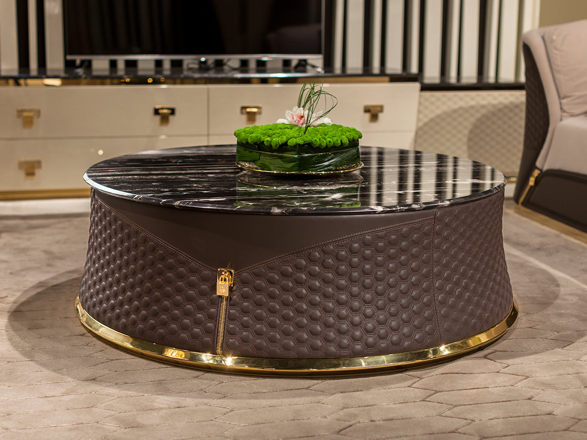 Bàn cafe Vogue gây ấn tượng bởi những đường nét tinh xảo và chi tiết trang trí sang trọng. Thiết kế chân loe nhẹ bọc da thêu, kết hợp khóa kéo kim loại vàng và chân đế hình kim cương mang đến vẻ độc đáo riêng biệt. Mặt bàn có thể tùy chọn giữa đá marble hoặc gỗ sơn bóng, phù hợp nhiều phong cách không gian khác nhau.