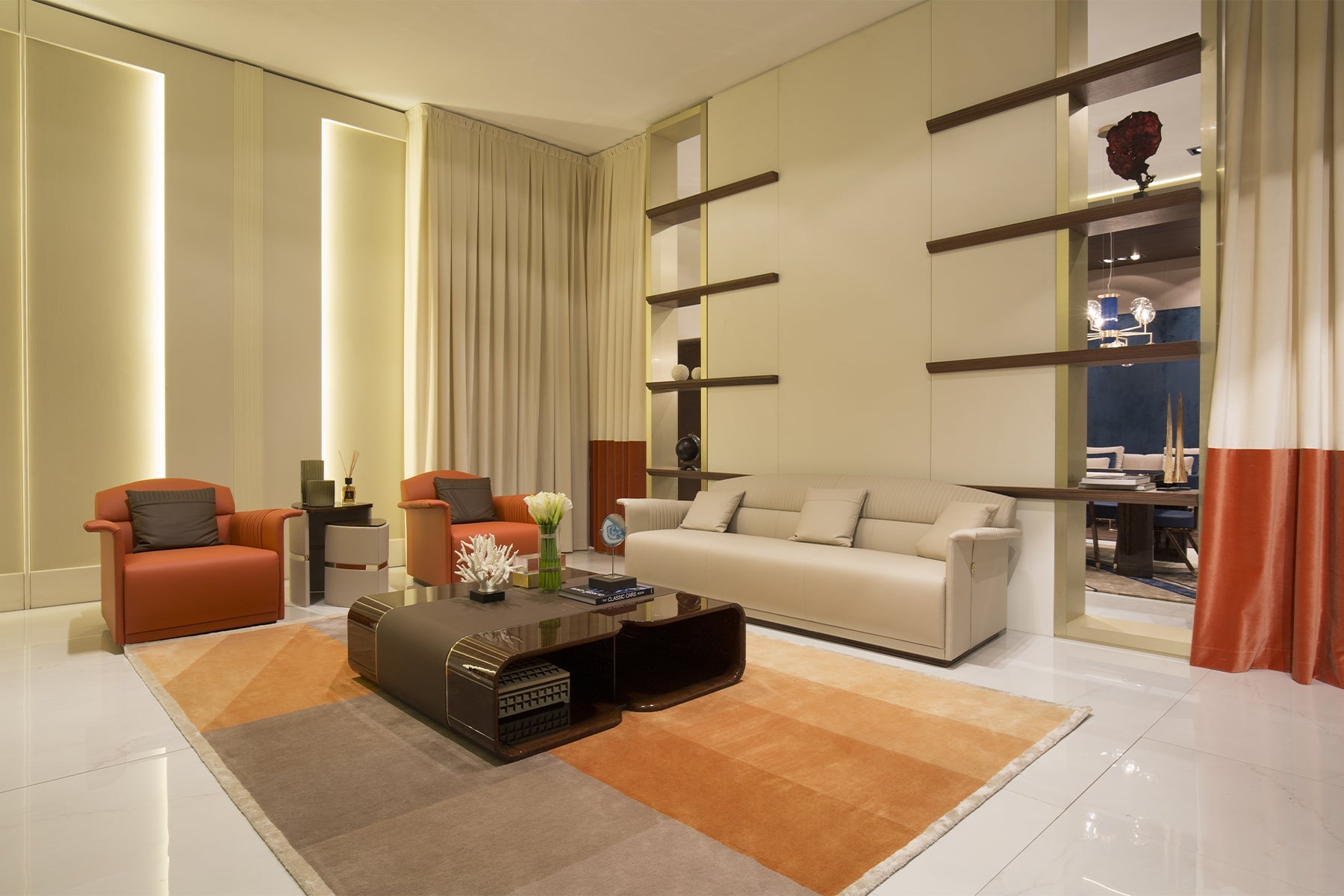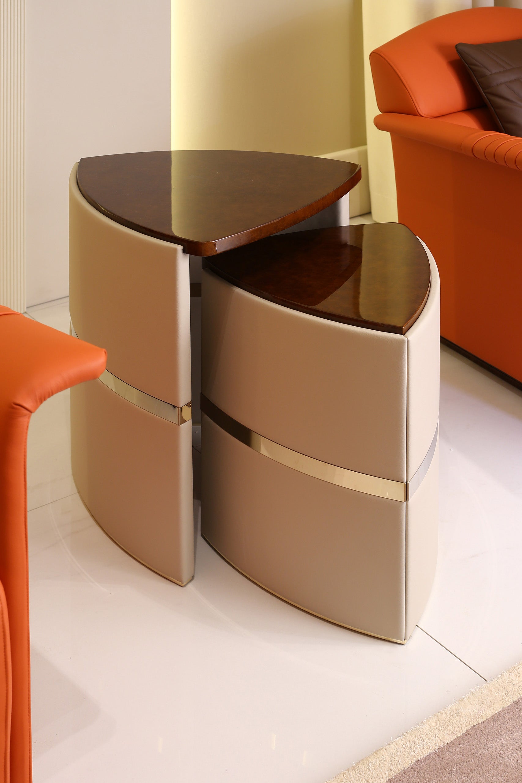 Bàn phụ Madison là một sản phẩm tưởng chừng đơn giản nhưng lại được chế tác phức tạp. Bàn có kết cấu bọc da, mặt bàn bằng gỗ sơn mài bóng, hình tam giác đặc biệt mở ra ở một bên. Chiều cao khác nhau cho phép kết hợp và phối hợp với bàn cà phê, các chi tiết kim loại vàng nhạt làm nổi bật hình dáng.