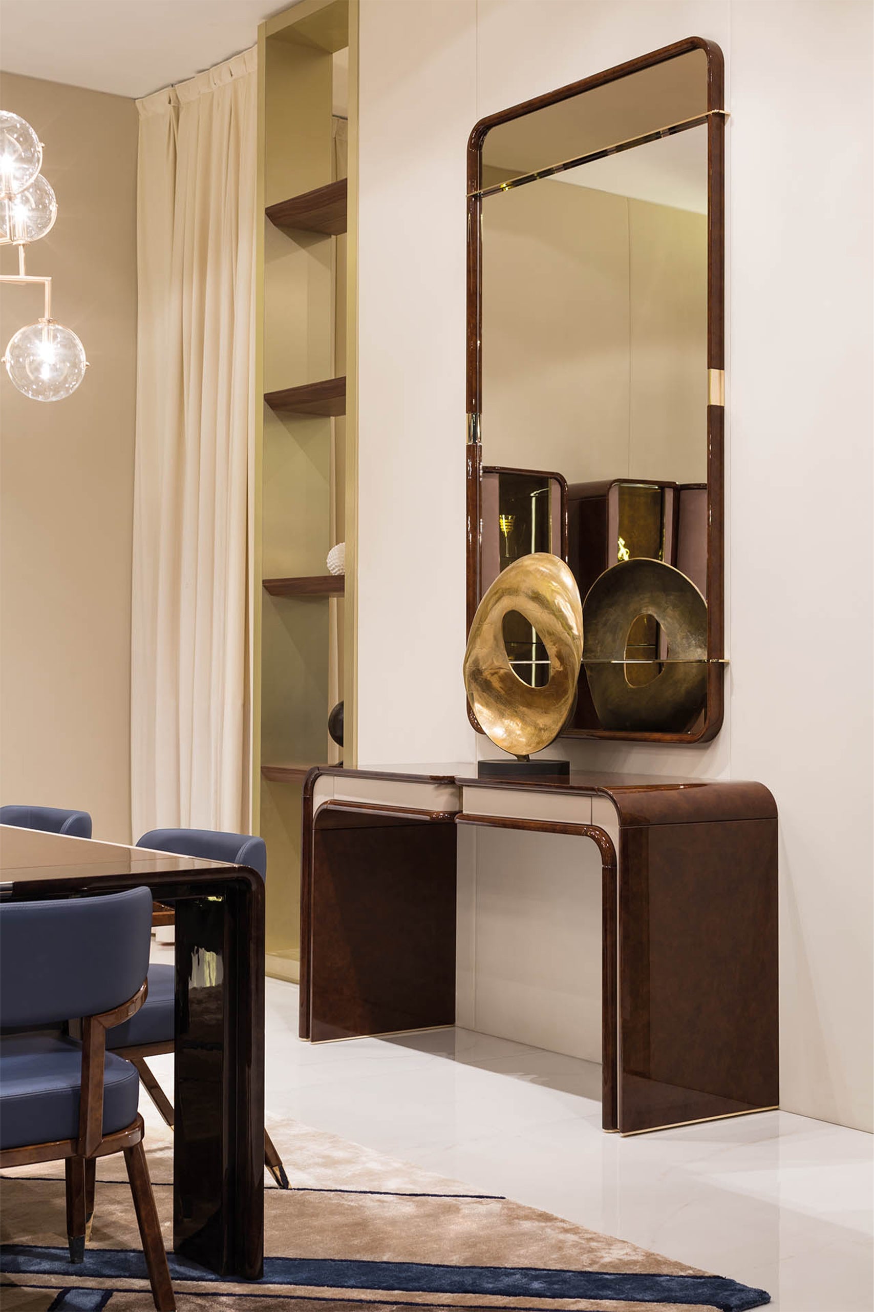Madison Console gợi lên tinh thần hiện đại của toàn bộ bộ sưu tập. Kết cấu cầu nối sơn mài bóng loáng với các chi tiết chèn da, hai ngăn kéo trung tâm được lót bằng sợi microfiber. Madison Console có sẵn nhiều màu sắc hoàn thiện tiêu chuẩn.