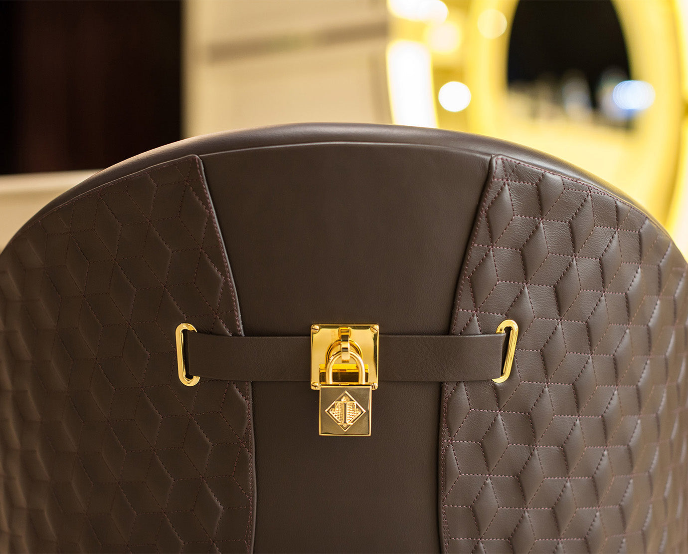 Vogue từ NTK Andrea Bonini là một chiếc ghế có cấu trúc bằng gỗ chắc chắn với lớp hoàn thiện bằng polyester bóng được trang trí thủ công. Bọc bằng da hoặc vải không thể tháo rời với tựa lưng thêu hình lục giác. Các bộ phận kim loại được hoàn thiện bằng vàng. Có sẵn phiên bản có tựa lưng cao hoặc thấp.