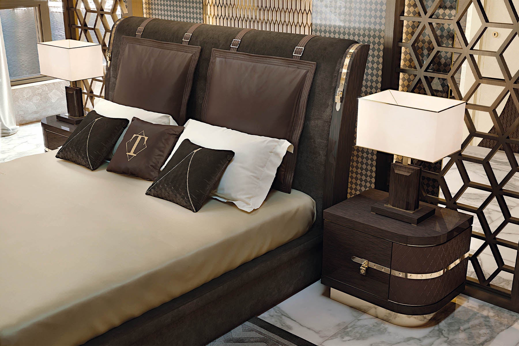 Tủ đầu giường thuộc bộ sưu tập Diamond được thiết kế theo kiểu dáng bên phải và bên trái. Khung gỗ được hoàn thiện bằng sơn mài bóng và được trang trí bằng các miếng da chèn bao phủ phần cong của tủ, cùng các chi tiết kim loại mạ vàng như khóa móc và chân tủ. Ngăn kéo chính có một ngăn kéo thứ hai có thể thu gọn.