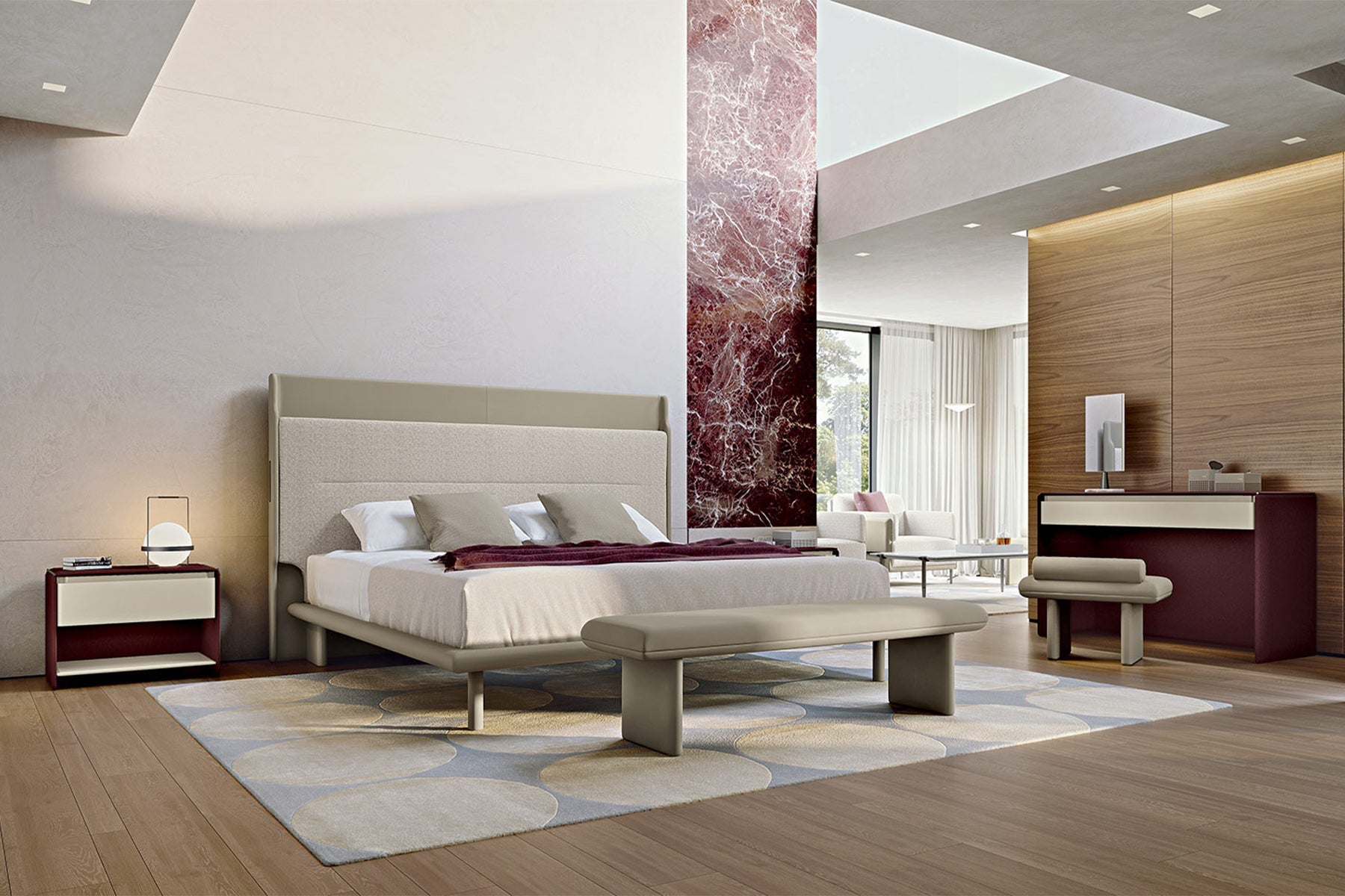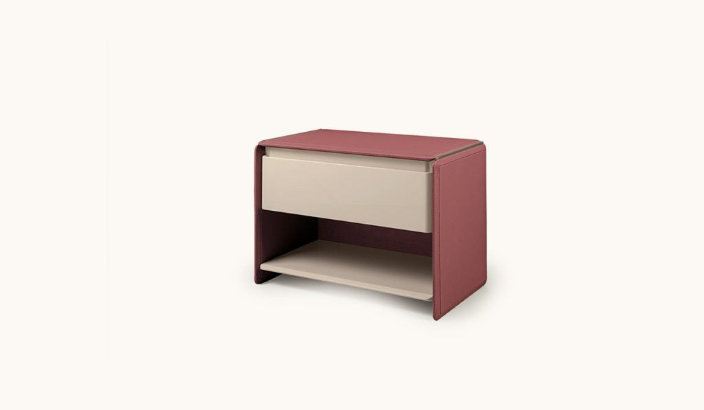 Tủ đầu giường Zero được bọc da với một ngăn kéo gỗ sơn mài bóng. Ngăn mở giúp làm sáng kết cấu bằng cách tạo ra một không gian chức năng. Mặt trong của ngăn kéo được bọc vải microfiber với lớp đệm nhẹ bên dưới.